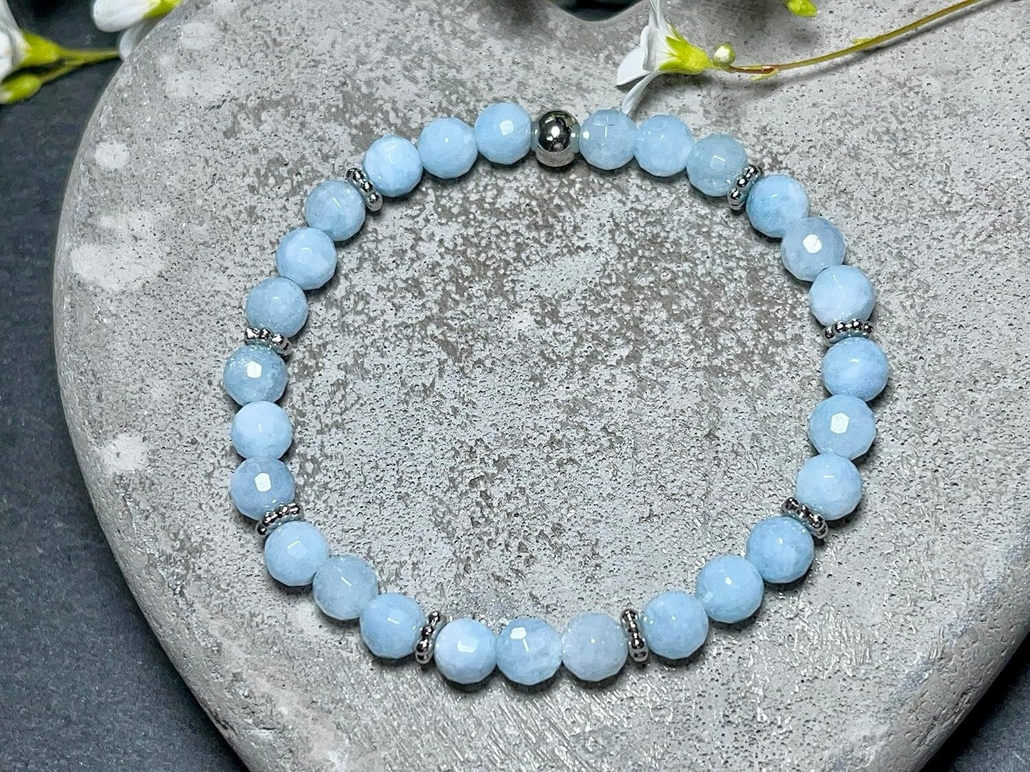 Aquamarin Armband Perlen echt 6mm und Daisyperlen Platiniert oder Vergoldet - Handmade Perlenarmband Selbstbewusstsein Liebe Glück Frieden