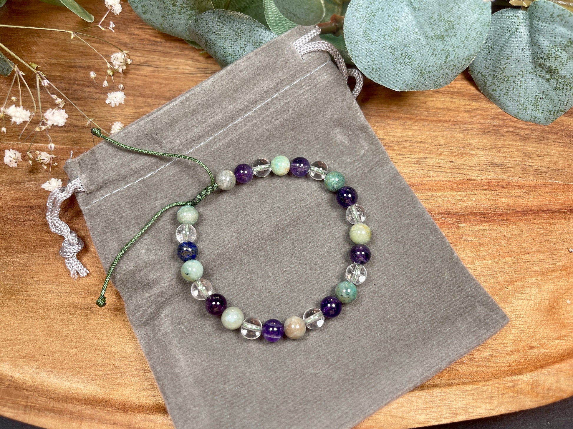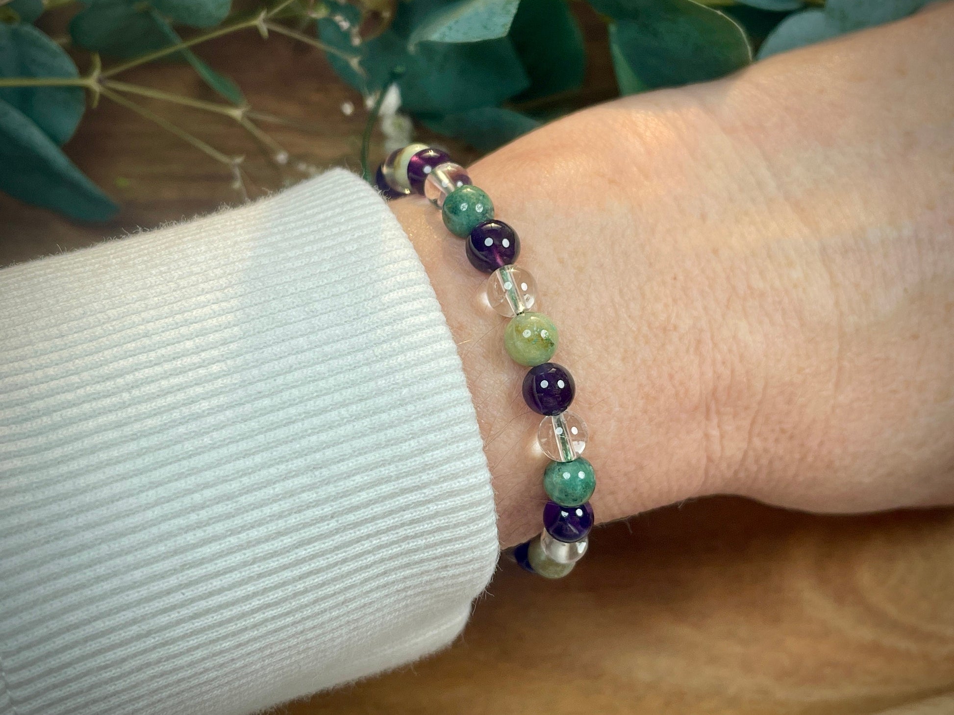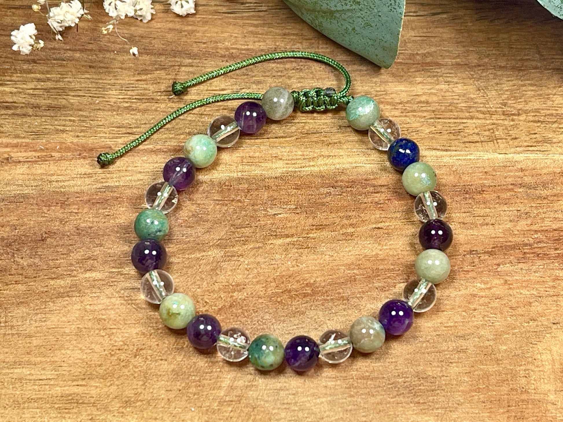 Ein Armband mit Amethyst, Bergkristall und Chrysokoll kann aufgrund der individuellen Eigenschaften dieser Steine vielfältige positive Wirkungen haben: