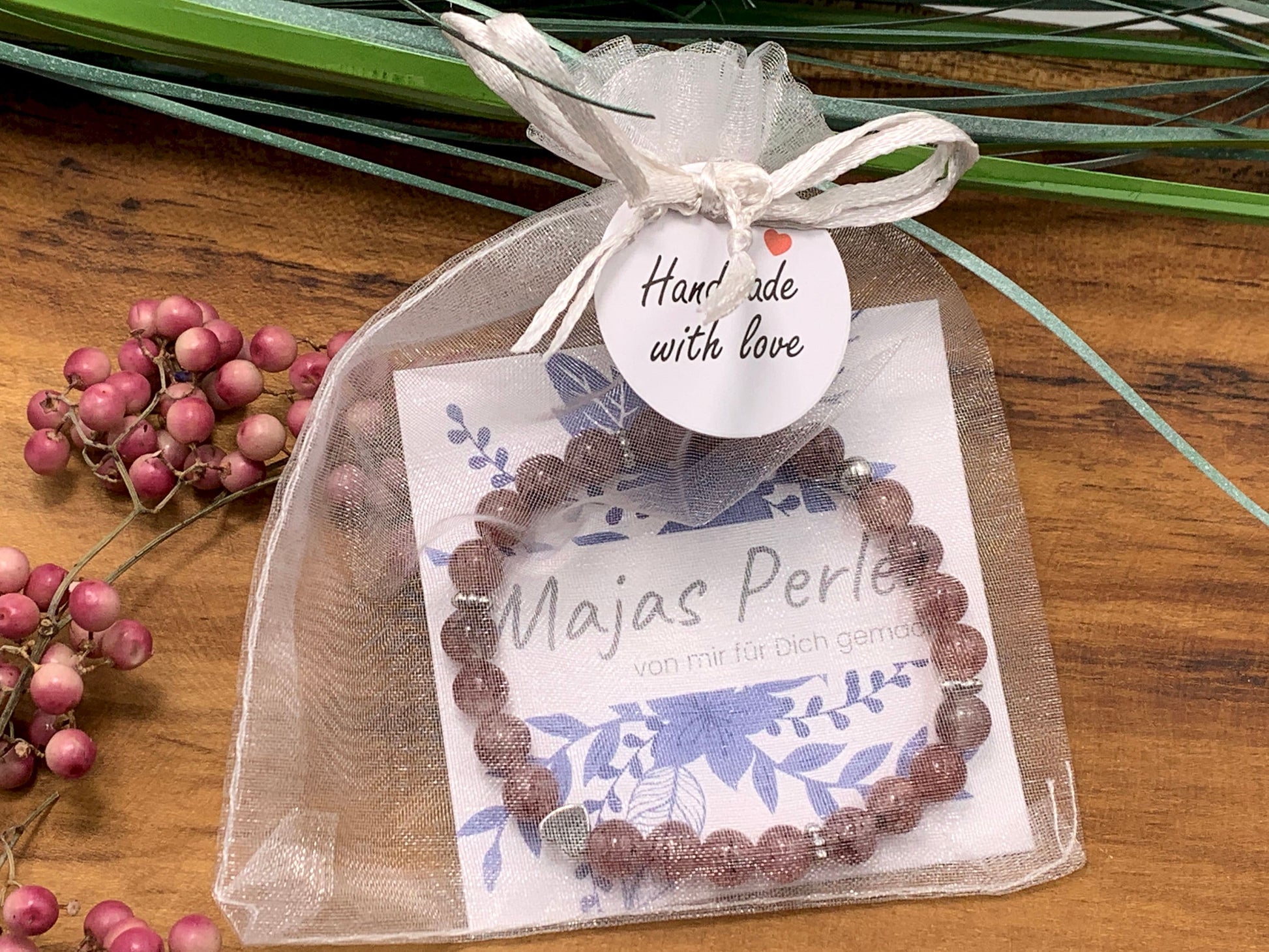 Das Perlenarmband wird ansprechend in einem Samtbeutel verpackt und ist somit sofort als Geschenk bereit.