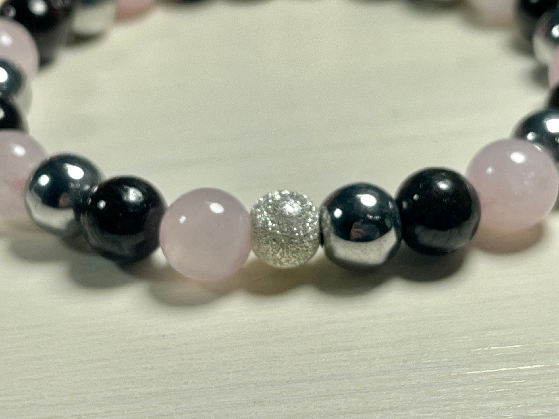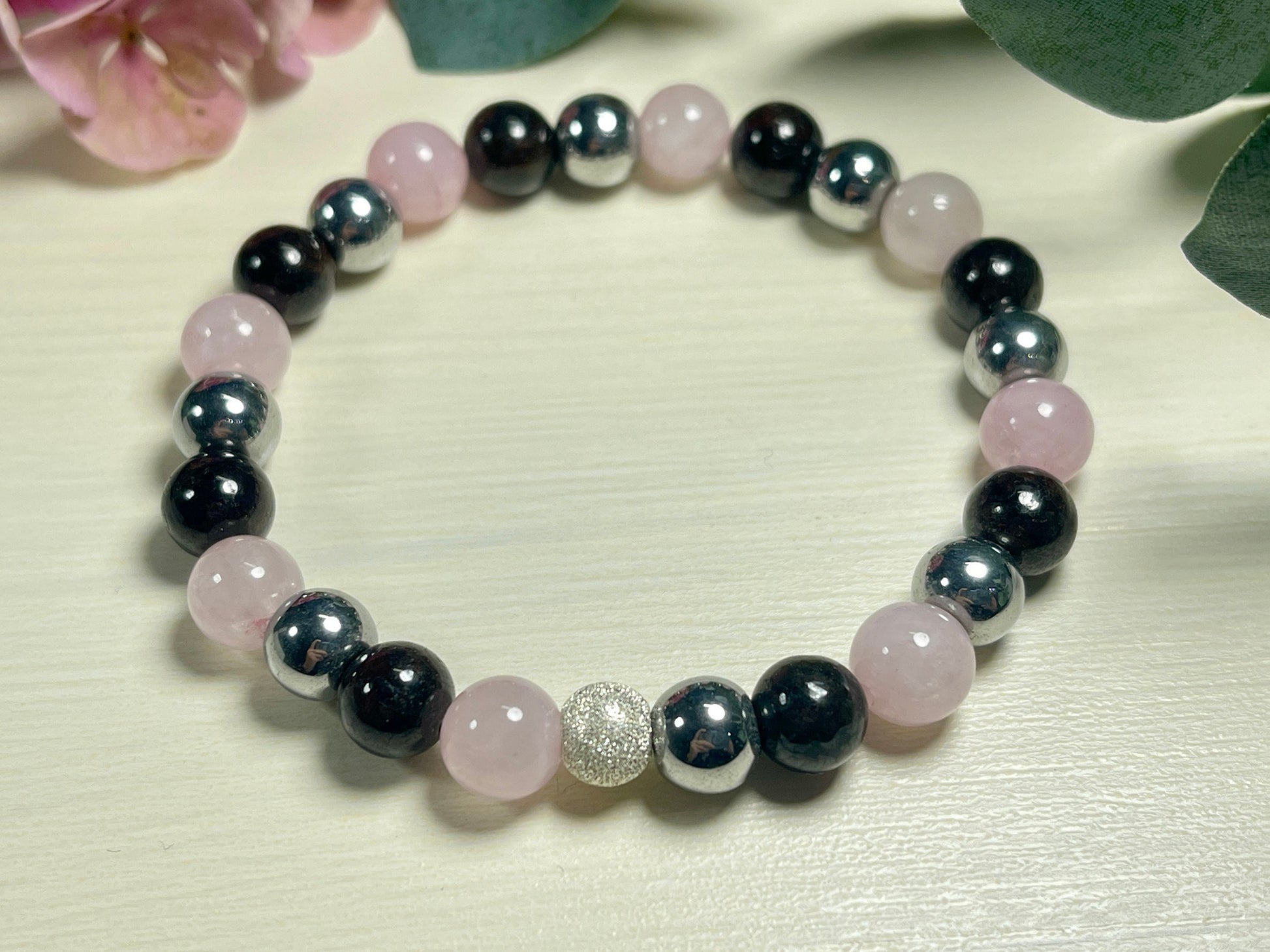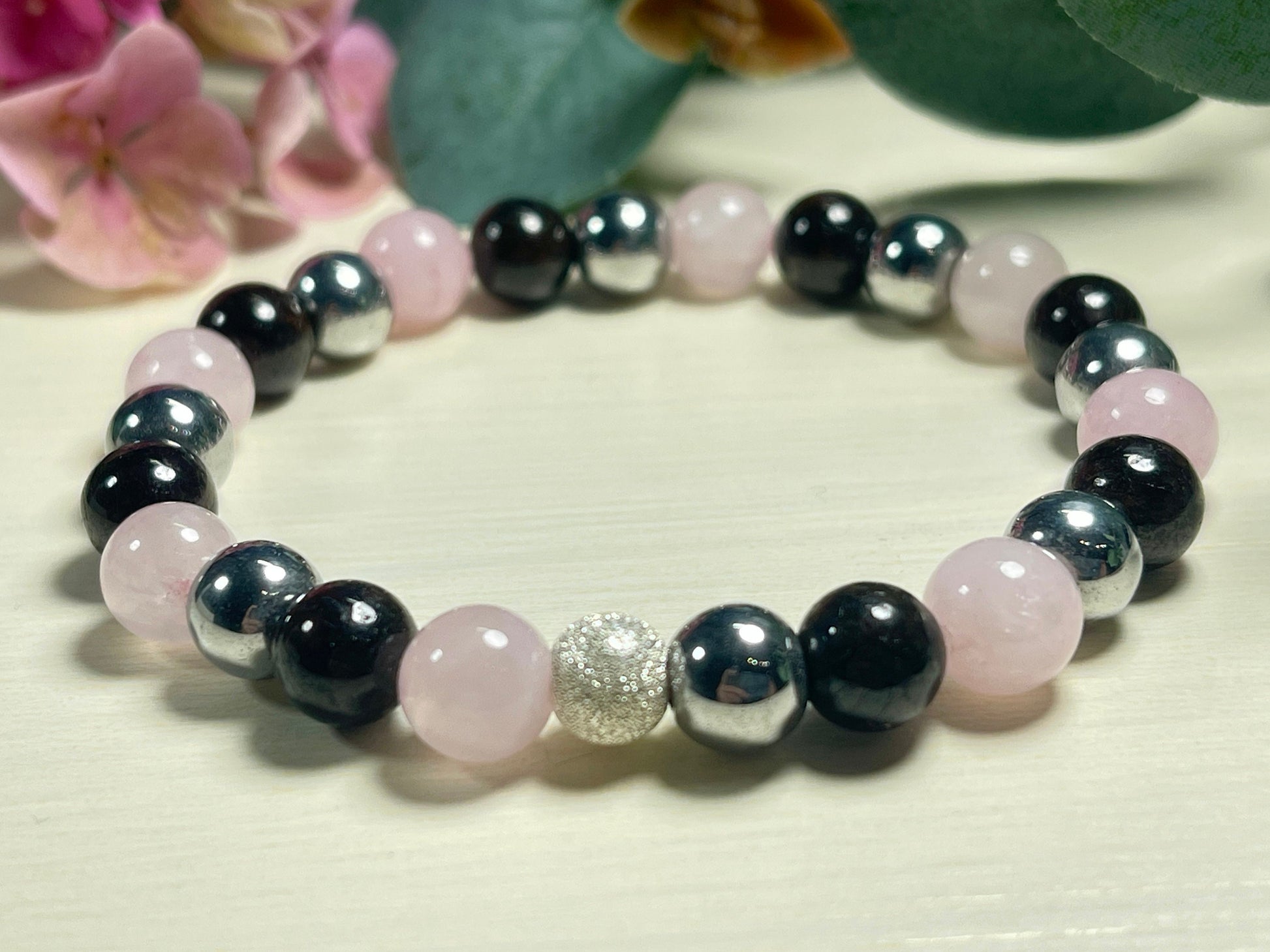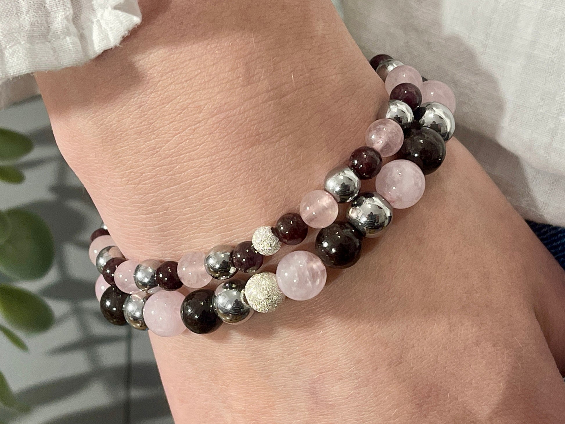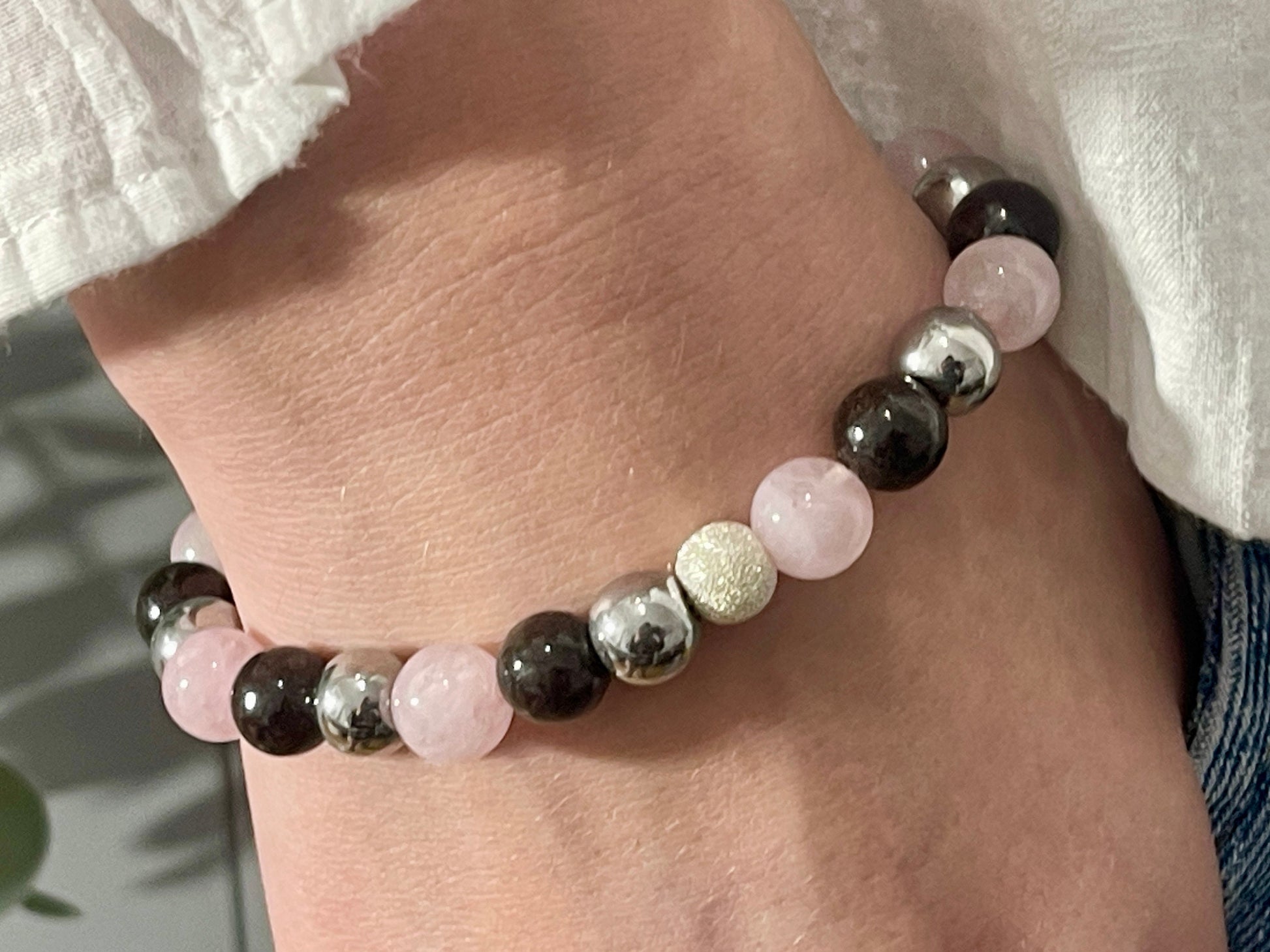Das edle Armband, handgefertigt aus faszinierenden, unbehandelten Edelsteinperlen, bestehend aus Rosenquarz, Hämatit und Granat. Die ausgewogene Zusammenstellung dieses Armbands ist darauf ausgerichtet, dir während der Wechseljahre beizustehen und Unterstützung zu bieten.