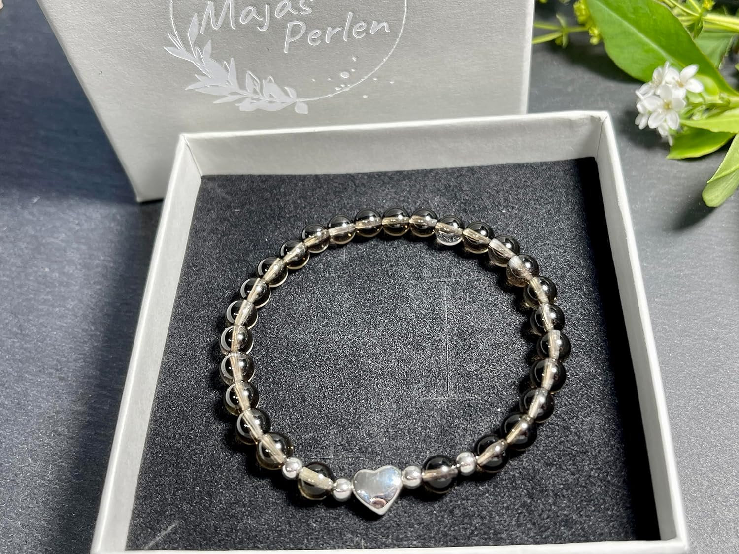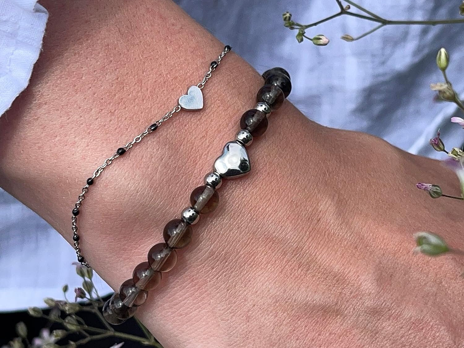 Ein Perlenarmband mit hochwertigem Rauchquarz. Dieses zauberhafte Accessoire ist kombiniert mit einem silbernen Edelstahlherz und Edelstahlperlen.