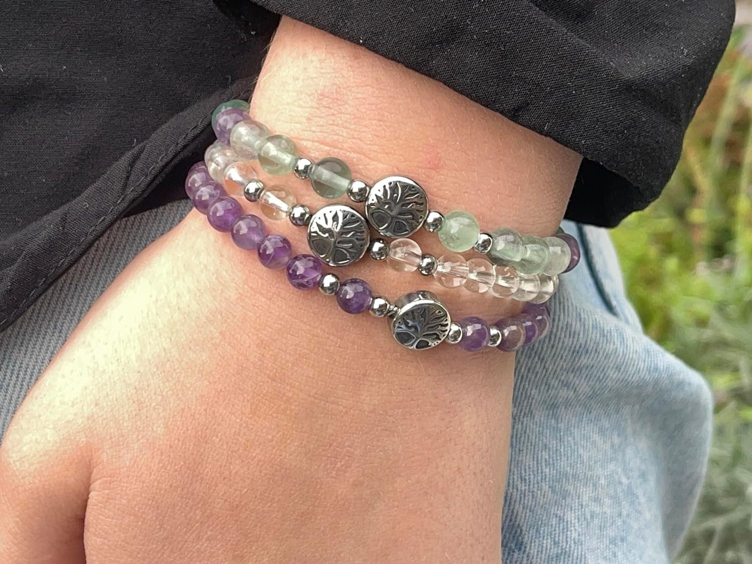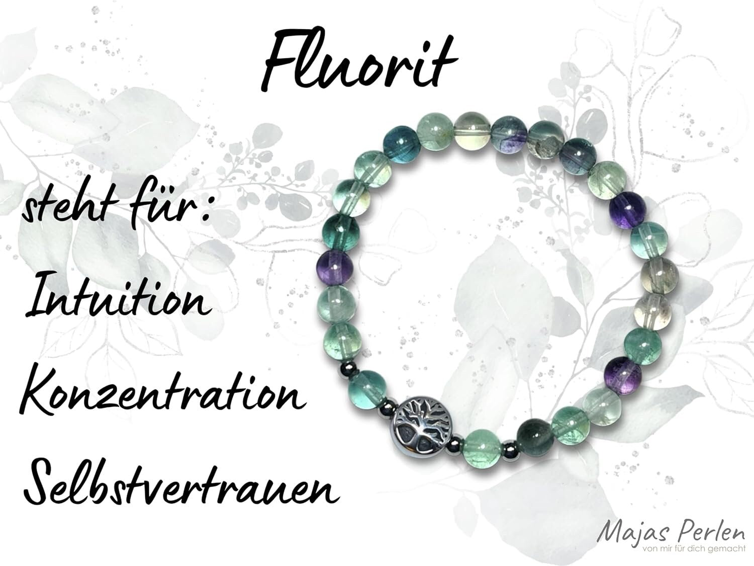 Fluorit Armband mit Perlen echt 6mm Lebensbaum Edelstahl Silber oder Gold - Handmade Perlenarmband Intuition Konzentration Lebensfreude