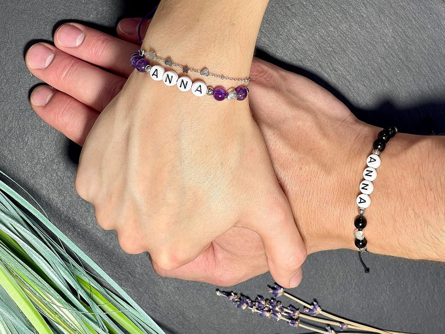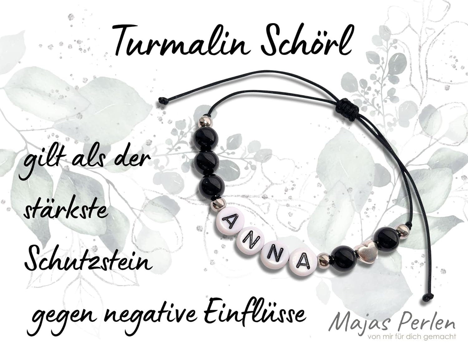 Majas Perlen Armband mit Namen Turmalin Schwarz Herz DQ - alle Größen einstellbar XS bis XXL - echte Edelsteine und Edelstahl - Unisex