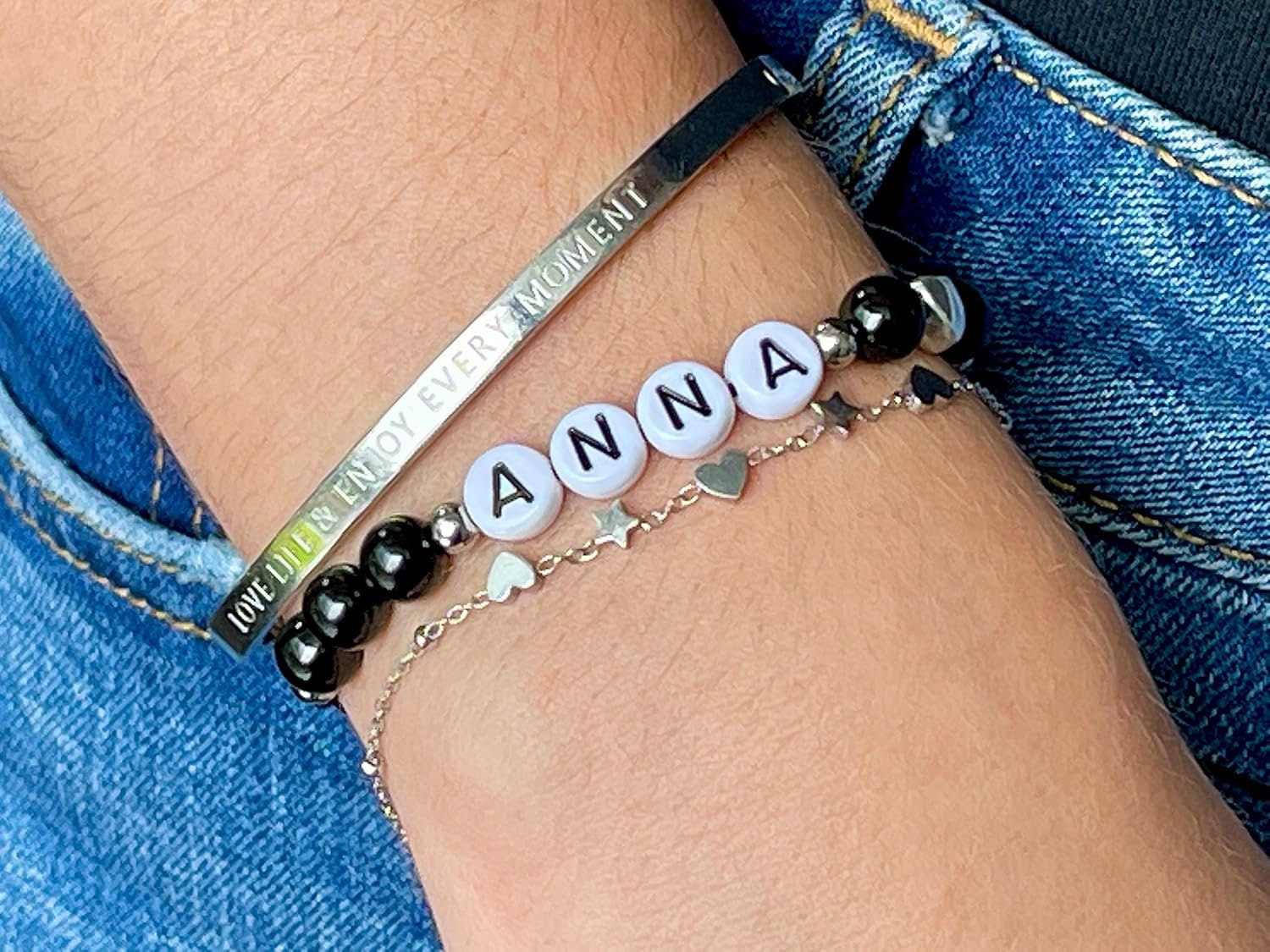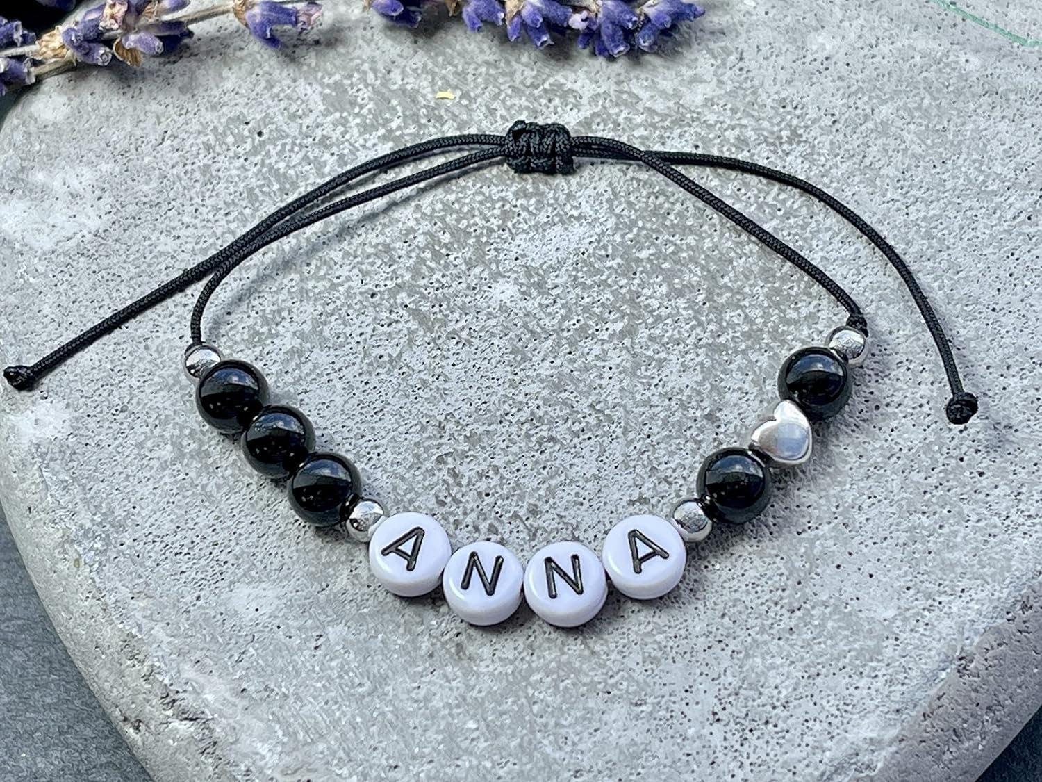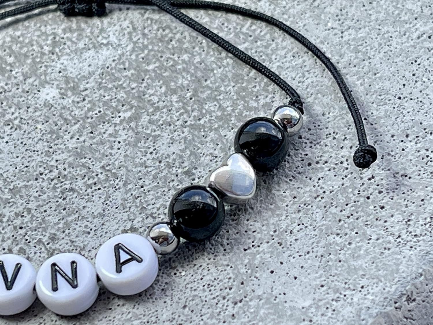 Namensarmband aus echten Turmalin Schwarz Edelsteinperlen mit wählbarer Beschriftung und niedlichem Herz